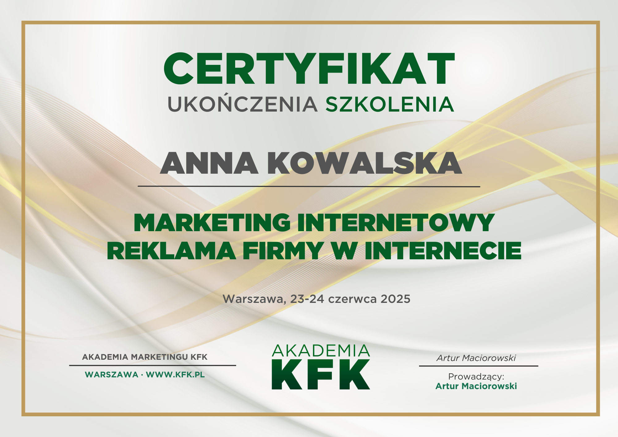 Każdy uczestnik naszych szkoleń otrzymuje imienny certyfikat ukończenia szkolenia potwierdzający udział i zdobyte kompetencje. Certyfikaty są uznawane przez firmy w całej Polsce i stanowią dowód podnoszenia kwalifikacji zawodowych w dziedzinie marketingu.